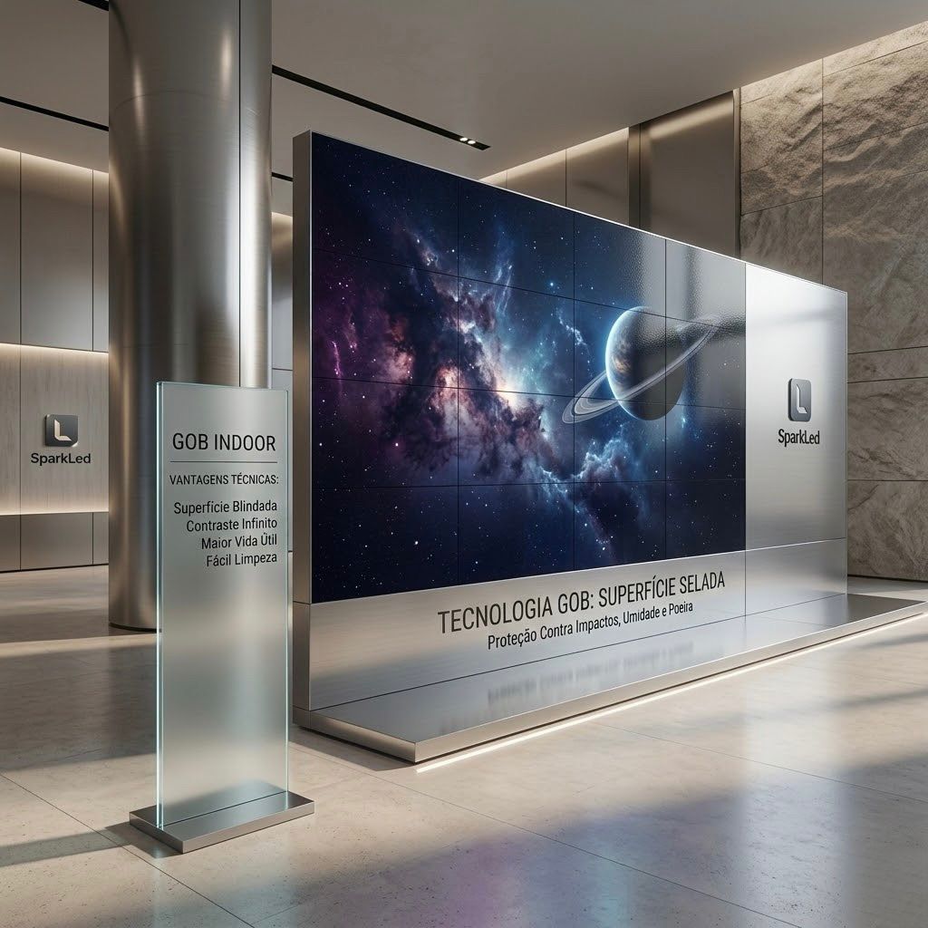 Diferente dos painéis comuns (SMD) onde os LEDs ficam expostos e frágeis, o GOB oferece uma superfície selada. É a escolha obrigatória para ambientes comerciais, vitrines baixas e eventos onde há risco de o público tocar ou esbarrar na tela.”